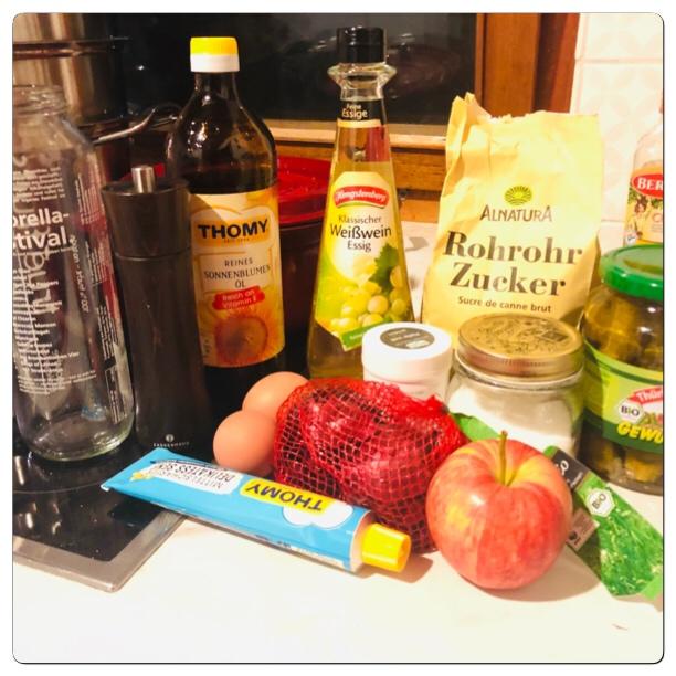 13042016 - Berlin potato salad or Berliner Kartoffelsalat in German is a specialty from the capital of Germany Berlin. 1 kg Pellkartoffeln vorwiegend festkochend. 100 ml Distelöl oder Sonnenblumenöl.